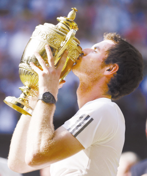 在近30摄氏度的高温下,这场比拼体力与意志的压台大戏,耗时三小时九分钟。夺冠的一瞬,默里扔掉球拍,扔掉遮阳帽,握紧双拳,冲着明媚的蓝天,激动地怒吼;他随后跪倒在地,双手掩面,用头顶着这片一年前就想征服的草地。去年的决赛,虽然首相卡梅伦、英国王室成员都像7日一样到场助威,但默里还是不敌费德勒,让英国人的梦多延一年。