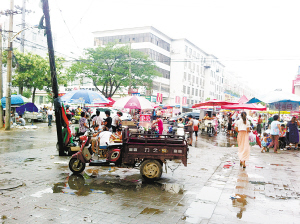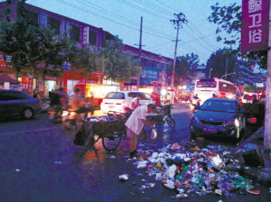 雨刚停下,流动摊贩撑起的大伞还没收起,五颜六色的众多大伞撑在交叉口周围,一道杂乱的“风景线”就这么产生了;沿街饭店开始在店门口的人行道上摆桌子占位置,如果将这些造型各异、高低不同的桌子连成一片,相信又是一道杂乱的“风景线”。