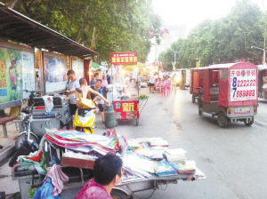 再往北走,卖烧烤的、卖发饰的、卖冷饮的……多个占道经营的流动摊贩聚集中州大道一峰超市门口的公交站牌前。由于天色已经暗下来了,他们摊位上都亮起了灯。除此之外,还有几辆非法营运的机动三轮车,车上的驾驶员不停地问过往行人,“去哪儿,坐车不坐,给你便宜点”。