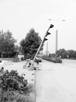 难道是因为学生放假,周口师范学院门口的这个交通信号灯也想趴下歇一个暑假?站直喽,可千万别趴下,因为你是交通信号灯!晚报记者 郭坤 摄