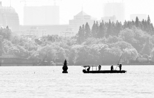 7月29日晚,杭州西湖一艘游船偏离既定航线,冲破护栏,将“三潭印月”中南侧石塔水面部分撞入水中。经过杭州园文、警方人员连夜打捞,落水石塔于7月30日清晨6点左右被打捞出水。目前该石塔已基本修复,并在“三潭印月”周围水域拉起了警戒线。新华社发