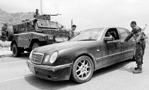 在伊拉克首都巴格达,美国使馆所在地“绿区”外竖立新的防爆墙,士兵加强盘查前往“绿区”的车辆和人员。