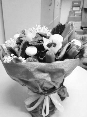 于是他从花店买了一些漂亮的包装袋,直奔菜市场,在菜农大妈那里买了一把香菜,他用粉红色的包装袋包扎上漂亮的蝴蝶结,再去买来一些大白菜、鲜木耳、金针菇、番茄、油麦菜等等,分别用不同的彩带包扎成漂亮的花形,集结成一大束花。