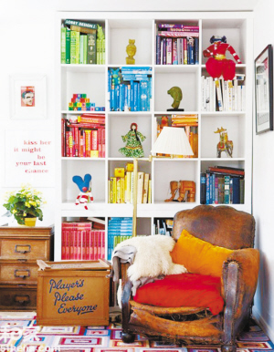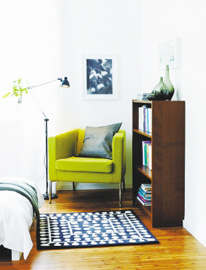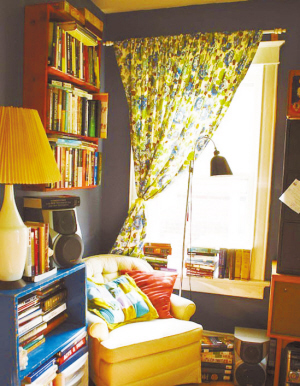 凹进去的墙面则相对简单,直接用木板打造成错落的储物架,摆放上不同的物品,装饰与实用兼具,成为墙面的一道风景。或用几把同款但颜色各异的塑料椅子,随意摆放在墙前,在边上立一个套有透明塑料灯罩的灯,感觉夏日的清凉与个性同时显现出来。 (可儿)