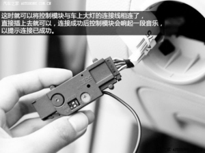 拔掉原厂大灯开关后,让大灯控制模块和车上的线缆相连接,如果连接成功,会响起一小段音乐。如果音乐响起,表示我们已经成功了一大半,如果音乐没有响起,请检查是否接触不良,或者大灯控制模块是否有故障。