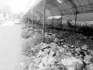市民多次向本报反映,称市直一中北侧有一处荒废的市场被各种垃圾占据。对此,本报曾予以关注,并将情况反馈给有关部门。 8月13日上午,记者刚走到七一西路和经三路交叉口,就闻到一股刺鼻的酸腐味,附近一处荒废的市场里堆放着各种垃圾,其中不少垃圾已经蔓延到路面上(图二)。垃圾里长有不少杂草和灌木,可以看出这个垃圾堆存在很长时间了。