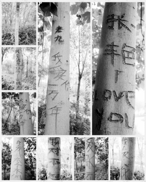 位于周口文昌生态园里的百余棵景观树被人刻上了“爱情宣言”(如图)。据园内工作人员介绍,在树上刻下“爱情宣言”的多为学生情侣。