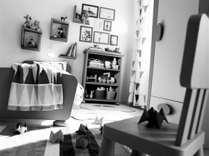 游戏区的储物柜高度最好和孩子身高相吻合,衣柜和吊杆都应该放在孩子触手可及的地方,最好选择轻便的轨道顺滑的抽屉。距离地面有一定高度的抽屉应该有锁定系统,不然储存重物的抽屉掉下来会伤到孩子,与地面接触的抽屉最好是带滑轮的。