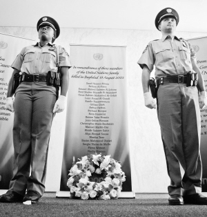 纪念仪式当天上午在联合国秘书处大楼举行。联合国秘书长潘基文在一楼大厅向2003年驻巴格达办事处爆炸袭击事件中殉职的22名联合国工作人员敬献花圈,带领在场的联合国官员和各国外交人员默哀一分钟。随后,他会见了部分殉职工作人员的家属。