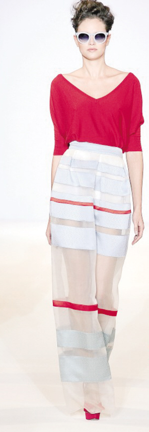 毕竟炎夏,若一直高调闪耀,恐怕视觉疲劳抵受不住。所以今季的高调荧光,搭配的是透明感。Vivienne Tam在2013春夏秀中,用几何图形的挖剪处理,来裁剪短裤和超短裙,带来透气感。“露脐背心裙”几乎是她告诉你的最佳度夏装。而雪纺的大量运用,令薄纱透视长裙,带来下半身的摇曳性感。