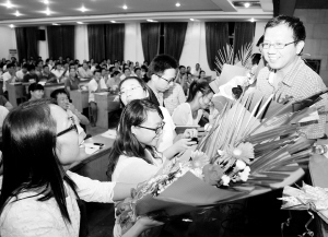 本报讯 “老师您辛苦了!请多指教!”9月4日,在郸城某高中举行的导师制拜师仪式上,一位新任教师手捧鲜花,向其导师敬献鲜花,并鞠躬致敬(如图)。当日,有75位刚走上教学岗位的新任教师与导师结成对子,开展导师制传帮带活动。