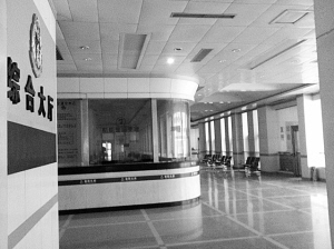 当日7时40分,记者来到市交通局道路运输管理处(以下简称“运管处”)综合大厅,由于天阴,大厅内没有开灯,室内光线较暗。大厅中心位置是一个用玻璃封闭起来的“厅中厅”(以下称“小厅”),小厅的服务窗口(如图)多为运管处“专用”,包括道路旅客运输、道路班线客运经营、道路货物运输、道路危险品货物运输、道路运输经营者考试考核以及从业资格证核发等9项行政审批项目服务窗口。