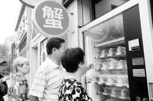 图为市民在了解自动售蟹机的售卖情况。新华社发