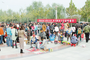 9点左右的桥南路西小广场已经人头攒动。工作人员按4人一组,分别为每组发放了用来摆放物品的大红摊布。了解了活动规则后,换物节也就热热闹闹开始了。