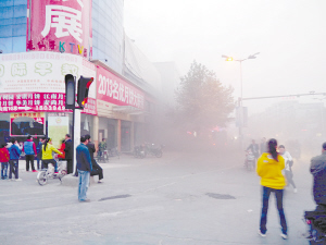 记者赶往现场途中,看到一股黑色浓烟从交通大道方向朝北飘去,烟雾长达数百米(如图)。17时28分,记者到达现场,看到浓烟从靠近马路的一家大型酒店中向外扩张。此时,酒店门前的马路已经被浓烟淹没,浓烟散发出皮革焦煳的刺鼻气味,一旦靠近,就令人感到呼吸困难。市民从此处经过时,脚步匆匆,纷纷慌忙闪避。由于地处闹市,浓烟引来众多路人围观,现场交警不断疏散人群,以保持道路畅通。
