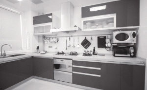 面积较大的厨房,除了有一字形和L形外,更多会呈现U形、走廊形和变化形。U形工作区共有两处转角,和L形的功用大致相同,但空间要求更大些。走廊形则是将工作区安排在两边的平行线上,可以将清洁区和配膳区安排在一起,而烹调区单独一边,餐桌则可安排在最尾。色彩上则可选择似火的红色,宽广的空间会被红色渲染出欢乐,比较适合活泼好动、张扬个性的家庭或是新婚家庭装修,既能充分展现出喜庆,又不失设计感。