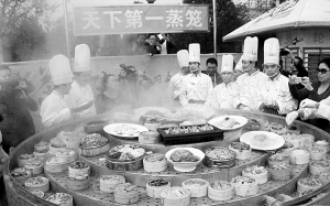 11月9日,一个巨大的蒸笼在湖北省天门市开笼,这个蒸笼将手工制作的当地特色蒸菜集于一笼,该蒸笼高1.8米、底部直径3米有余、蒸有128道菜的“天下第一蒸笼”亮相2013年天门美食周。(宗欣)
