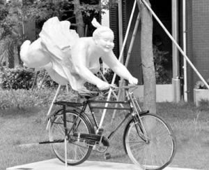 忽然,女人屁股离开自行车座,立起身子,双脚站在一左一右两个脚蹬上,开心地笑起来。