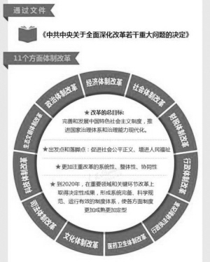 全会审议通过了《中共中央关于全面深化改革若干重大问题的决定》。全会要求,到2020年,在重要领域和关键环节改革上取得决定性成果,形成系统完备、科学规范、运行有效的制度体系,使各方面制度更加成熟更加定型。