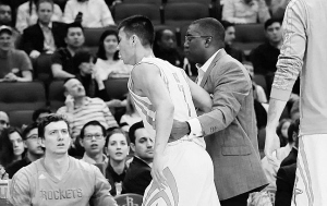 火箭队球员林书豪(前左)在比赛中受伤离场