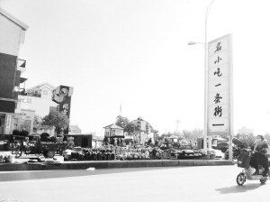 周口市区中州大道北段的周口市文化产业园门口的次干道上,多个卖水果和卖衣服的摊贩长期在此占道经营,这个以茶叶茶具、书画艺术、电影古玩等为主营的清净高雅园区俨然成了一个小集贸市场。晚报记者 徐松 摄