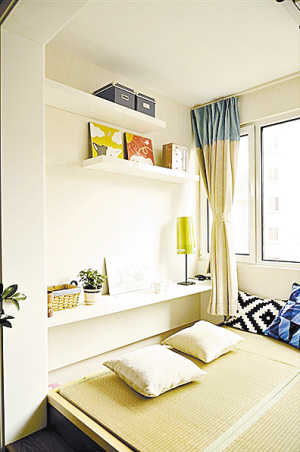 9榻榻米的墙角空间用一些置物架增加墙面空间利用率。