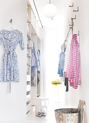 进门处的墙角,可以用来做一个简单却十分实用的更衣区。最上面的搁架用来放一些外出用的帽子、雨具;下面的挂杆则可以悬挂外套、围巾;墙上钉上几排挂钩,上层安置容易弄丢的钥匙串儿、门卡,下层可以挂一些常用的包包;最下面的区域则可以摆一个伞架,用来收纳雨伞。基本上所有出门需要取用的东西都可以很方便地拿到。