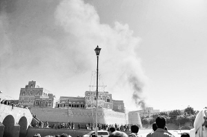 12月5日,在也门首都萨那,也门国防部内冒起黑烟。