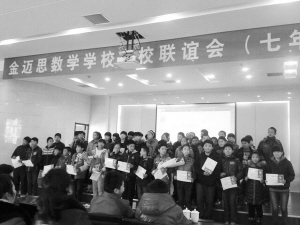 近日,金迈思数学学校召开七年级家校联谊会,会上,金迈思优秀老师与家长分享教育心得,就“如何成就孩子”做了精彩演讲。图为会上受表彰的优秀学员。(金思 摄)