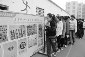 近日,周口市交警支队联合周口市教育局组织对全市各中小学校的学生进行交通安全宣传教育。市区交通大道的一所学校内,学生观看有关交通文明行为的展板。 晚报记者 朱东一 摄