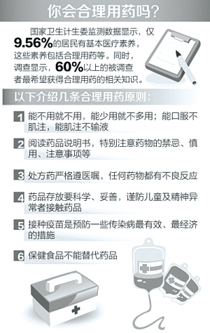 2012年,全国居民健康素养监测数据显示,具备包括合理用药在内基本医疗素养的居民比例仅为9.56%,能够正确阅读药品说明书的居民比例约为15%。2012年,我国国家药品不良反应监测网络共收到药品不良反应或事件报告120万余份。在全国合理用药网络知识竞赛中,只有6.3%的网友能够全部答对从试题库随机抽取的10道合理用药常识题。国家卫生计生委开展的公众调查结果显示,60%以上的被调查者最希望获得合理用药的相关知识。