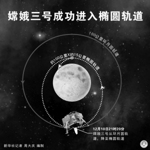 新华社北京12月10日电 (记者 余晓洁 左元峰)记者从国家国防科技工业局获悉,10日21时20分,嫦娥三号从100公里×100公里的环月圆轨道,降至近月点约15公里、远月点约100公里的椭圆轨道。这是嫦娥三号预定的月面着陆准备轨道。