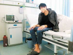 12月4日,家住周口市区七一路和文明路交叉口附近的李晨突然咳嗽吐血,然后住进市中心医院,被确诊为马凡氏综合征。12月10日,记者见到李晨时,他正坐在病床上接受治疗(如图)。李晨虽然有2.01米高的个子,但看上去手脚细长,十分消瘦。