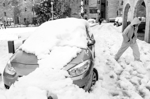 同日,古城耶路撒冷也遭遇了一场突如其来的特大暴雪。这是耶路撒冷地区60年来最大的一次降雪。大雪没有阻挡住虔诚的信徒们的脚步。在耶路撒冷老城的阿克萨清真寺,信徒们在冰天雪地中前来祈祷。