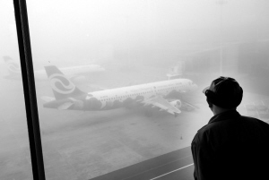 12月18日,一名旅客在候机楼内看着笼罩在大雾之中的客机。