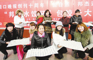 本报讯 12月22日,是《周口晚报》创刊10周年纪念日,恰逢冬至。《周口晚报》联合邦杰水饺厂举办大型公益活动,在主会场——周口市区五一广场举办了“邦杰水饺杯”包饺子大赛,99名参赛选手按两人一组分成5轮参赛(一参赛选手是单人组),历时两个多小时的激烈角逐,把今年冬至过得温暖、温馨又充满饺子香味儿。同时,晚报和邦杰水饺厂准备了500份《周口晚报》、500袋精品水饺免费送给现场读者。另外,晚报记者和邦杰工作人员兵分9路,把一袋袋邦杰水饺送到各界读者手中,使得晚报墨香和着饺子香味儿飘满全城。