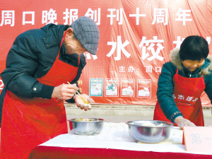 本届包饺子大赛是双人制比赛,参赛的选手搭配有母女、姐妹、同事等各色组合,最多的还是夫妻携手登场。在台上,记者看到一对老年夫妻搭档,妻子在认真地擀面皮,丈夫则站在一旁乐呵呵地包着馅(如图),两个人动作和谐默契,这一场景在冬日的阳光下,像是一幅美丽的油画。