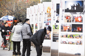 本报讯 “这是豫皖两省交界处的一条河流,这是商水县大武乡境内的一棵千年银杏树,这是边界一个村庄的新民居……”昨天上午,在周口市区五一广场南侧,面对围观的市民,本报记者一边布展,一边耐心讲述照片背后的故事。