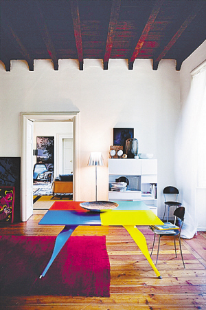 四色撞击的桌子对比强烈,成为房间的主角,稳重的复古造型给色彩坚强支撑,并没有明显的杂乱感,成为房间亮点。