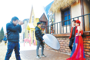 昨日上午,一对新人正在刚被评为“省级文化产业重点招商项目”的周口好莱坞婚纱影城拍摄婚纱照片。据影视城负责人段杰介绍,该项目一期工程投资1000多万元,建筑面积近万平方米,建有包括欧式、韩式、海景等数百个取景点, 已经成功接待1万多对新人。二期工程投资500多万元,现已初具规模。
