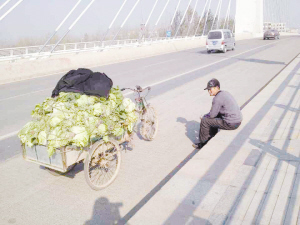 一辆三轮,一车白菜,一个桥的上坡,一张布满沟壑的面孔,一个阳光下孤独的身影……生活,就是这个样子。