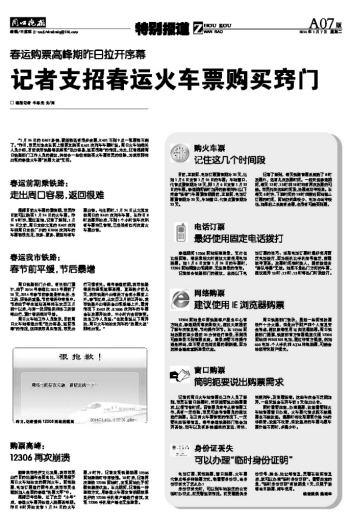 根据历年经验,过了农历“小年”后,春运火车票开始进入购票高峰期。昨日8时开始发售1月24日的火车票,9时许,记者发现铁路购票12306网站登陆时非常缓慢。10时后,记者再次登陆12306网站时,发现网站处于间歇性崩溃状态。在此期间,记者换一种登陆方式,用春运火车票发售初期效果良好的12306手机客户端进行尝试,发现12306手机客户端也无法登录。