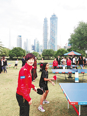 本报综合消息 正在迪拜参加国际乒联职业巡回赛总决赛的中国乒乓球队不仅瞄准了场内成绩,而且肩负着运动推广的重任,当地时间1月8号,国乒核心张继科、丁宁等人和阿联酋运动员携手开启社区项目“乒乓迪拜”的第二阶段工作——在迪拜的指定公园里安置免费乒乓球桌。