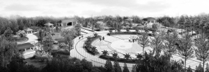 六合拳场:该景点是反映周口武术文化的重要节点。中心圆形场地为人们提供展示武艺与切磋交流的空间,并利用树池分割出若干个相对独立的小空间,布置形式多样的配套设备,如梅花桩、木人桩等,满足不同类型的武术爱好者的需求;