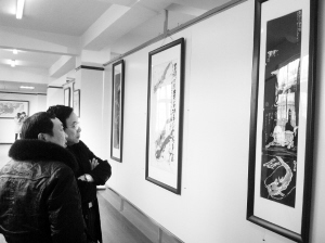 1月9日上午,由周口市国风文化艺术中心主办、周口报业书画院协办的“甲午迎春——鲁光、郭保同、禅一居士国画联展”在周口市区新建路国风文化艺术中心开展。国画联展展出的100余幅国画作品吸引了众多艺术爱好者的关注。图为展览现场。