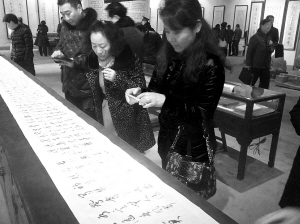 书法爱好者用手中的拍照手机将心仪的书画作品记录下来