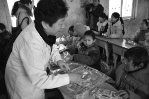 为让孩子们感受到社会大家庭的温暖,1月9日上午,周口妇产医院联合共青团周口市委一起来到太康县独塘乡小学,给那里的每名孩子送上一副手套、一个书包和一个文具盒。图为周口妇产医院工作人员为孩子分发礼物。记者 王映 摄