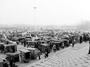 穿过一群机动三轮车向广场中央走,一路上不断有人问记者要不要坐车。“是不是去市区?”从一辆外观类似出租车的车辆上下来的一名中年男子问记者。“到汽车东站多少钱?”“20元,再等个人咱就走。”记者以不愿意拼车拒绝了。男子再三劝说,并提醒:“你再不走,过一会儿就该没车啦。”