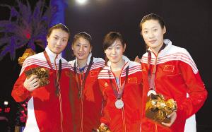 当地时间1月19日,(从左至右)中国选手许安琪、尹明芳、孙一文和孙玉洁在颁奖台上合影。当日,在卡塔尔多哈进行的2014年女子重剑世界杯卡塔尔站团体决赛中,由许安琪、孙玉洁、尹明芳和孙一文组成的中国队以18∶19惜败罗马尼亚队,获得亚军。