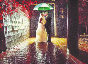 如果拍婚纱照当天遇到坏天气,估计很多情侣都会大失所望。但也有人反而将此当做享受,在坏天气下拍摄的婚纱照,风雨中的拥吻反而显得更加浪漫。据外媒报道,美国俄勒冈州摄影师贾斯汀·格拉富顿拍摄了一组新人们在恶劣天气中的婚纱照。如本图中,新郎在雨中撑起绿白相间的雨伞拥吻新娘,雨滴落在新人周围,令这一场景更加温情。